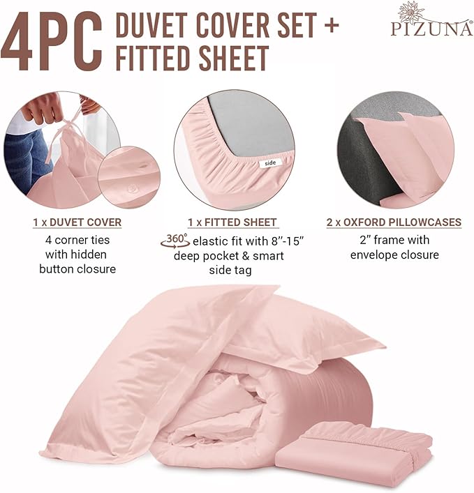 Pizuna 100% Cotton Full 3 Pc Duvet Cover + 1 Pc Fitted Sheet Set 400 Thread Count Light Pink Sateen Weave Luxurious Long Staple Cotton 4 Piece Bedding Set-1 Duvet Cover, 2 Pillow Shams, 1 Fitted Sheet