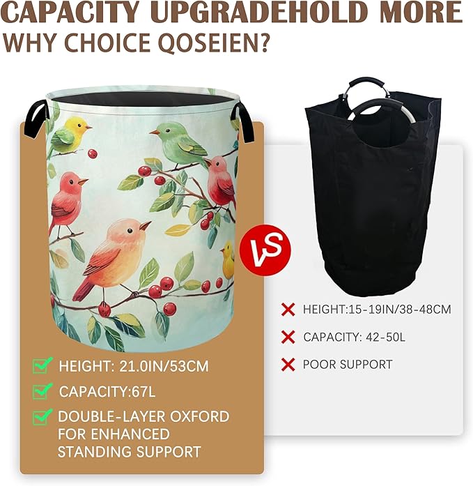 Colorful Bird Green Leaves Collapsible Laundry Baskets,Laundry Hamper,Storage Basket with Handles for Bathroom Bedroom College Dormitory Living Room Nursery Organizer 16"x20"