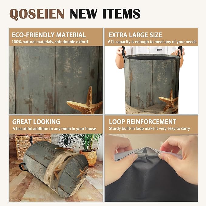 Large Laundry Basket,Sand Starfish Collapsible Laundry Baskets,Wood Board Waterproof Oxford Hamper with Handles for Bathroom Bedroom Nursery Home Storage 16"x20"