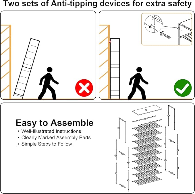 - Easy Assembly and Sturdy Design: This shoe rack comes with clearly labeled assembly parts and well-illustrated instructions, making it quick to put together. Additionally, the tall shoe shelf is equipped with two sets of anti-tipping devices for wall mounting, providing extra stability and safety.