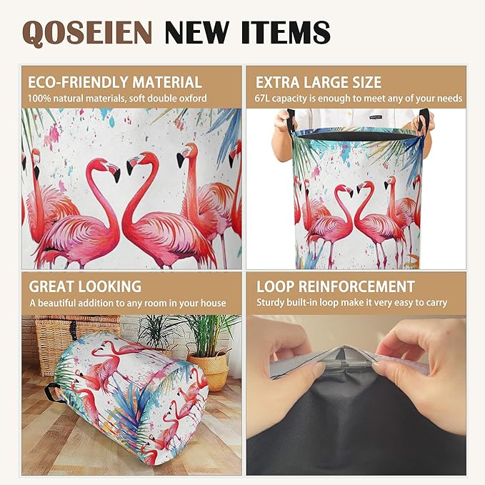 Flamingo Tropical Laundry Basket,Exotic Leaves Flower Collapsible Laundry Baskets with Handles,Waterproof Oxford Cloth Storage Basket 16"x20" for Bathroom/Bedroom/Dormitories
