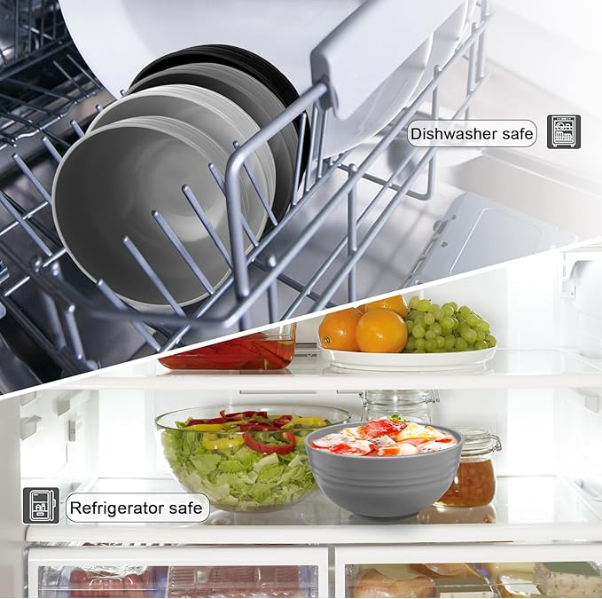 12 Pcs Unbreakable Rice Bowls Set, 26 Oz Wheat Straw Bowls Set, Microwave & Dishwasher Safe Bowl for Kitchen, Reusable Plastic Bowl for Soup, Salad and Snack, BPA Free, White Gray