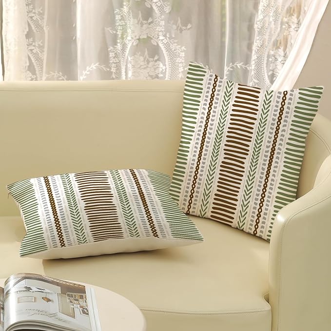 Boho Pillow Covers 18x18 Set of Brown Sage Green Stripes Throw Pillow Covers Outdoor Decoration,Abstract Modern Bohemian Farmhouse Linen Decorative Cushion Cover for Home Sofa Couch