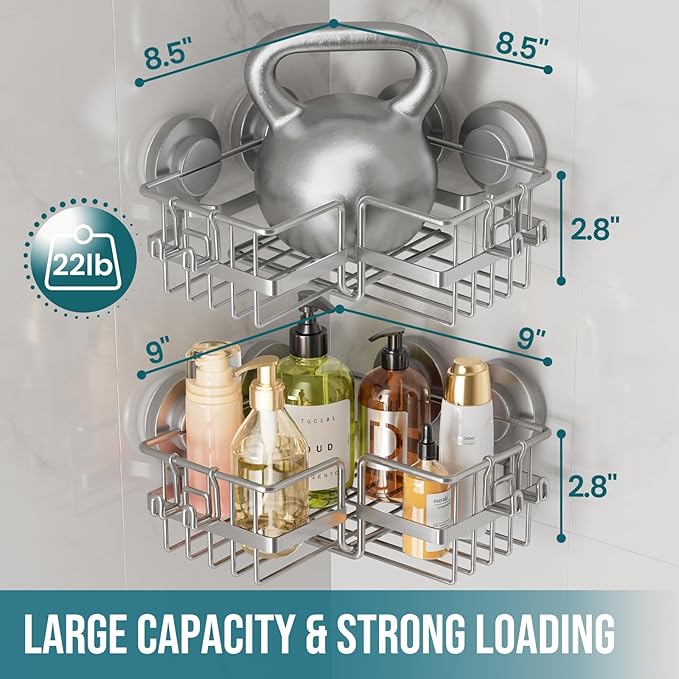 - Widely applicable: The shower caddy with suction cups is perfect for bathroom and kitchen storage, such as hand sanitizer, disinfectant cleaner, shampoo, conditioner, body wash, cleanser, kitchen utensils, etc., anywhere you need to organize storage. Each corner basket shelf has 2 hooks to organize loofahs, shower brushes and other bath products