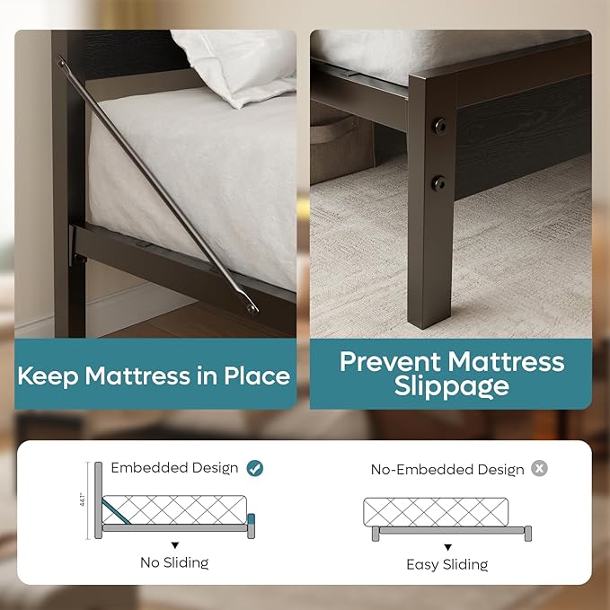 - 【Prevent Mattress Slippage & High Headboard Design】 Unlike other bed frames, The queen size bed frames with headboard features diagonal stops to keep mattress in place. The 44-inch high headboard offers a comfortable backrest and two side pockets for added convenience