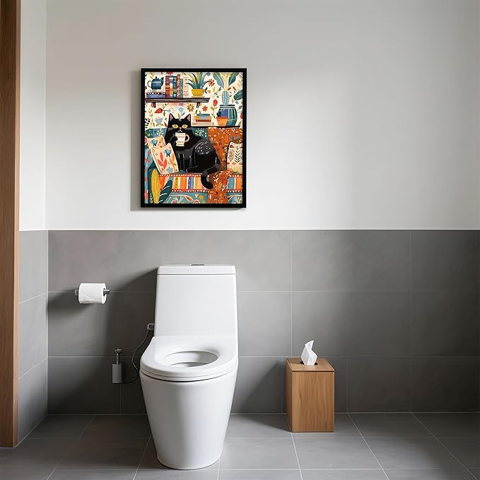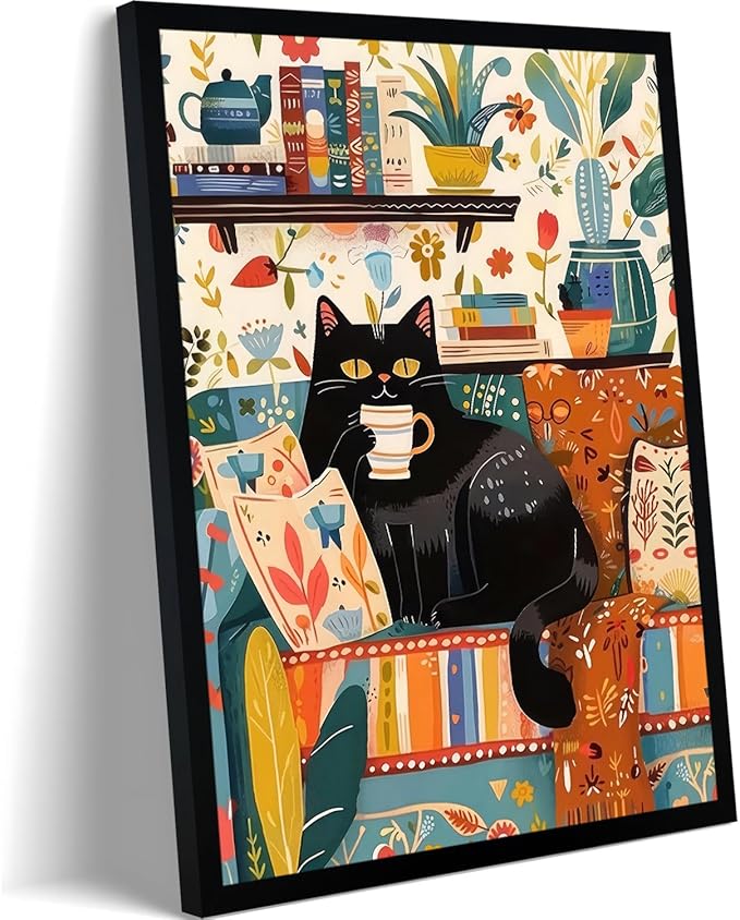 - 【cat Lovers Aesthetic Wall Decor】 Features an adorable black cat enjoying a cup of coffee, surrounded by a vibrant mix of books, plants, and decorative elements, adding a whimsical and cozy touch to any space