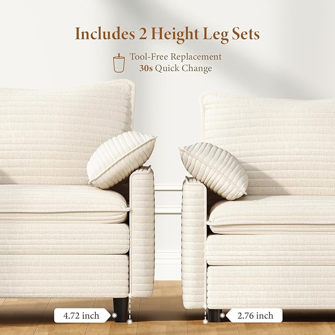 - Two Sets of Sofa Legs & Effortless Assembly: This sectional couch comes with two leg height options—2.76" and 4.72"—so you can customize the height to suit your preference. Choose the lower height for a relaxed look, or the higher height for easier access, which also allows robot vacuums to clean underneath with ease. Assembly is simple: with clear instructions and all the necessary tools included, you can have it setup in just 30 minutes with no extra equipment required