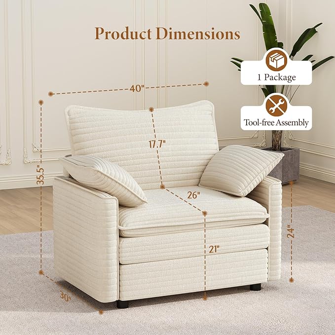Vesgantti 40" Single Seat Sofa, Comfy Cloud Couch Deep Seat Upholstered Couch Corduroy Modern Sofa with Armrest Pillow, Easy Assembly for Living Room, Bedroom and Apartment, Beige