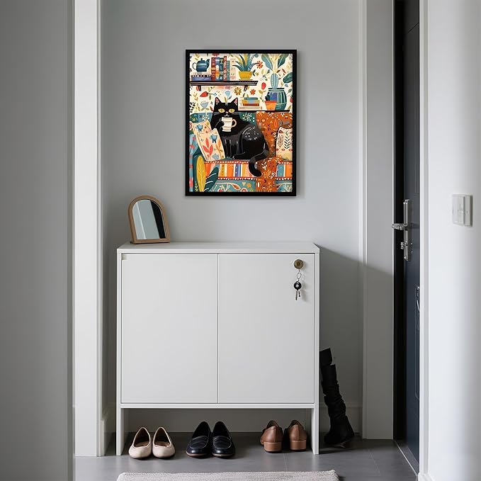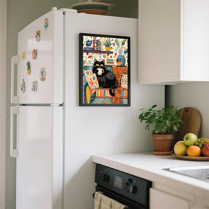 - 【cat Lovers Aesthetic Wall Decor】 Features an adorable black cat enjoying a cup of coffee, surrounded by a vibrant mix of books, plants, and decorative elements, adding a whimsical and cozy touch to any space
