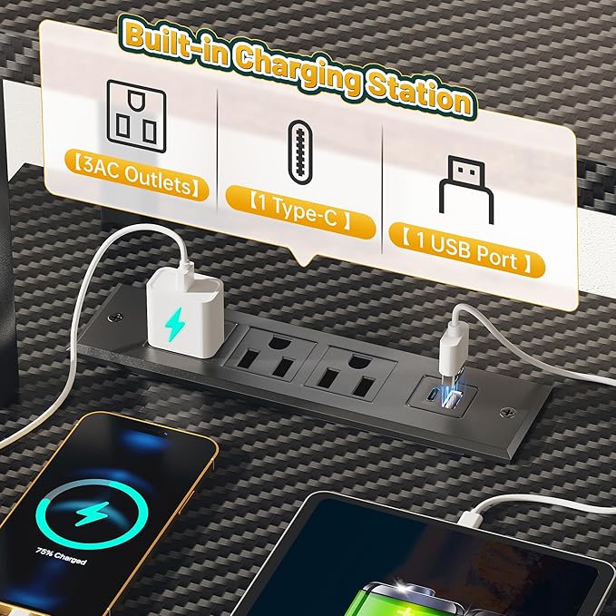 - Convenient Power Hub: The office desk features a built-in power station with 3 types of charging options, offering comprehensive charging and connectivity solutions for all your devices. Whether gaming or working, this versatile power hub of this gaming desk ensures seamless access to power whenever you need it.