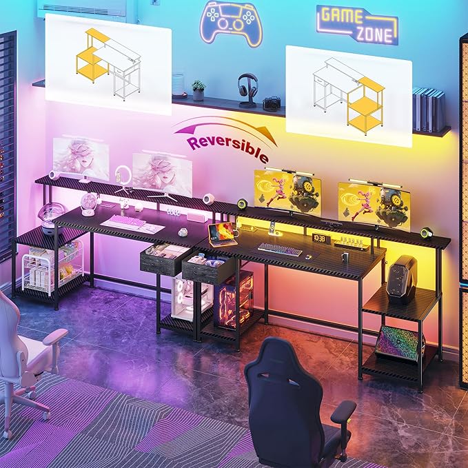 55" W Gaming Desk, Computer Desk with LED & Power Outlet, Office Desk with Printer Storage Shelves & Storage Drawer, Study Table with Monitor Shelf, Dorm Room Essentials, Black