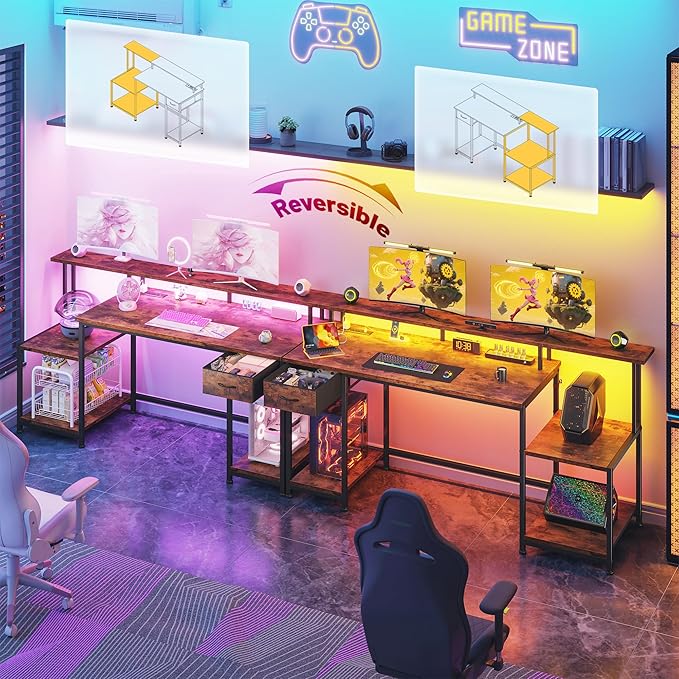 - Versatile RGB LED Lighting Desk: Dorm room essentials! This full-color LED strip of this gaming desk offers 20 dynamic and 20 static lighting modes, all controllable via a wireless remote with a 10-meter range. With a brightness of 30LM/W and a 120-degree beam angle, our executive desk significantly enhances your work and gaming atmosphere.