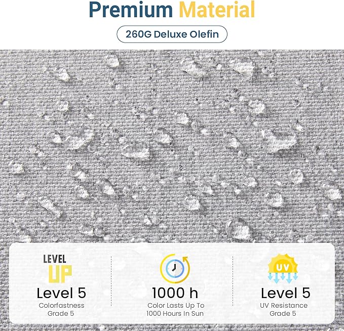 - Upgraded Cushions: This cushion, crafted from 260G deluxe Olefin fabric, blends style and functionality. With a color fastness rating of 5, its vibrant colors stay bright even after prolonged sun exposure. The soft, skin-friendly texture is ideal for homes with kids and pets, ensuring comfort and safety. Additionally, the precise stitching and high-quality inner lining showcase fine craftsmanship, adding elegance to every detail.