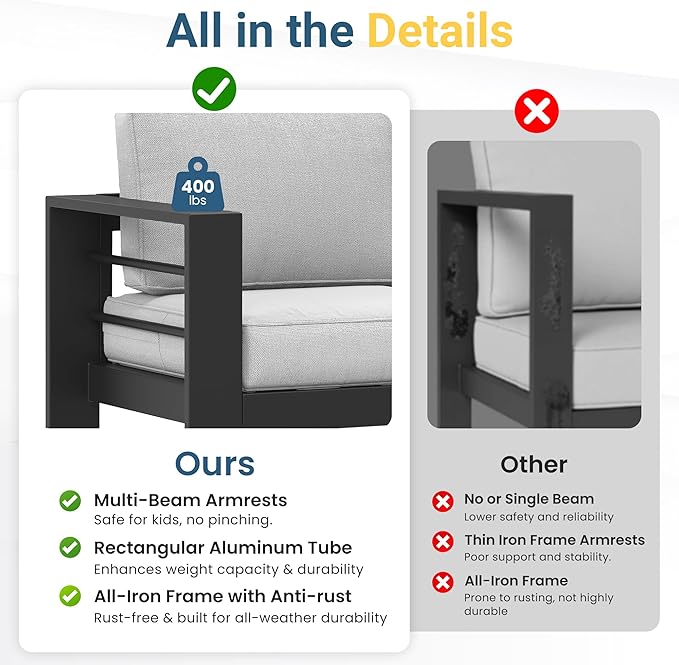 - Stable and Sturdy: Crafted with an all-iron frame, our outdoor sofa couch provides unmatched strength, stability, and resistance to deformation for long-lasting performance. The frame is coated with paint, which acts as a protective layer, preventing rust and ensuring enhanced durability in outdoor conditions. Its weight offers exceptional stability, keeping it firmly grounded even in strong winds—making it the perfect choice for outdoor use.
