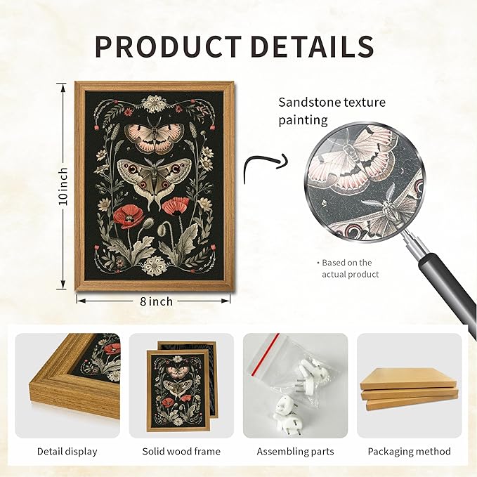 Vintage Framed Wall Art - 3D Textured Classical Style Moth Pictures Wall Decor - Hand Drawn Flowers Nature Art Painting for Living Room Bedroom Home Decor 8x10in