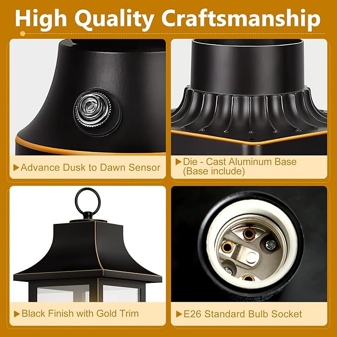 - Dusk to Dawn Sensor:This post lights outdoor dusk to dawn fixture features a built-in photocell sensor that automatically turns on at dusk and off at dawn. Free your hands, save on electricity bills, and enjoy convenient, energy-efficient outdoor lighting.