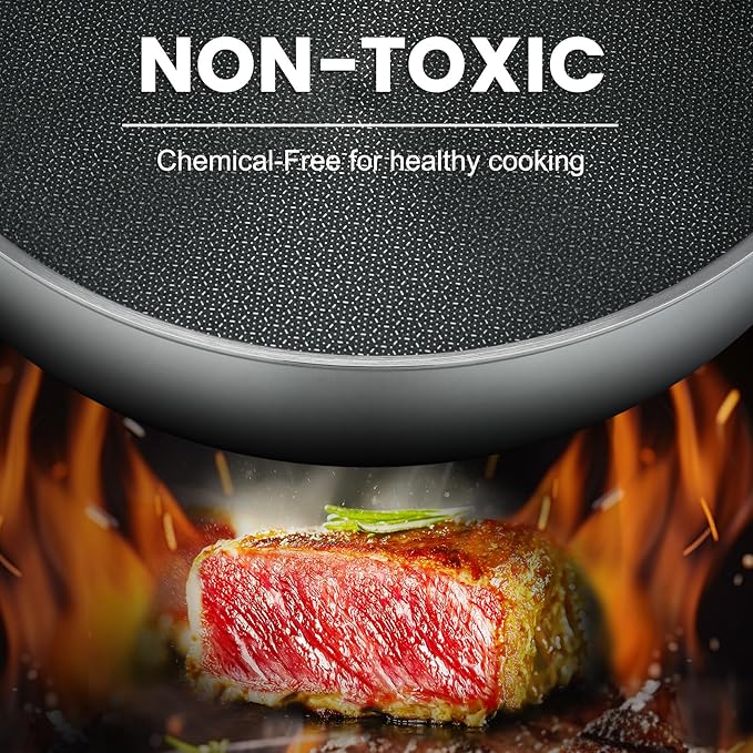 - 【Toxin-Free Assurance】 ATSENT non stick pan contains absolutely no PFAS, PFOA, PTFE or other questionable compounds. The ceramic based coating maintains integrity even at high temperatures, eliminating concerns about chemical substance. Cook confidently knowing every ingredient stays pure