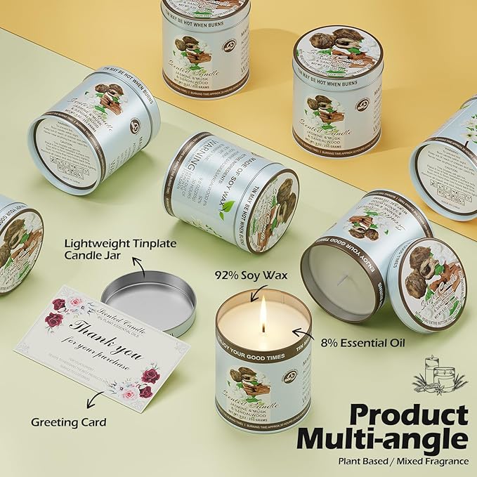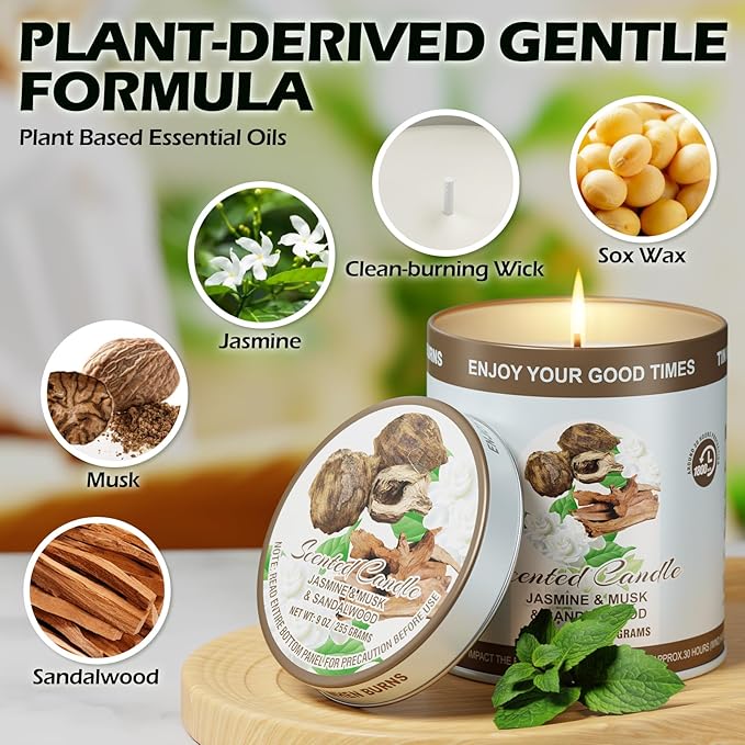 - Premium Aromatherapy Blend for Deep Relaxation Indulge in our luxury jasmine, musk & sandalwood scented candles—infused with 8% pure essential oils for intense, lasting fragrance. Perfect for meditation, yoga, or unwinding after work. The clean-burning soy wax eliminates smoke and toxins, creating a serene ambiance for stress relief and mental clarity