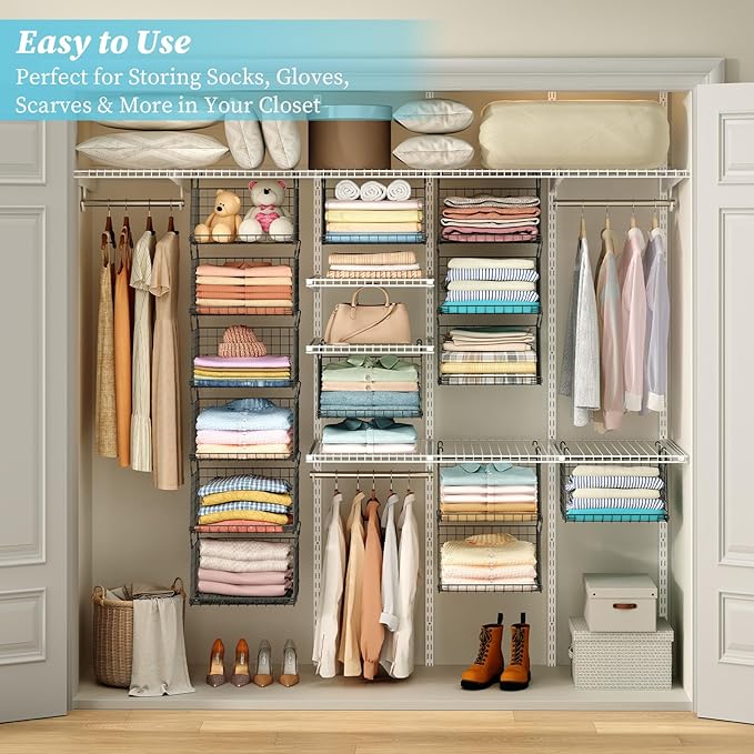 - 【360° Rotation Hooks & Diameter Compatibility】 This closet storage basket comes with built-in hooks that can rotate 360°, easy access, and convenient hanging. Please note the hooks are compatible only with wire shelving or racks with a diameter of 0.39 inches (10mm) or less to ensure a stable and secure fit. (This product includes baskets only and does not come with the wire shelving.)