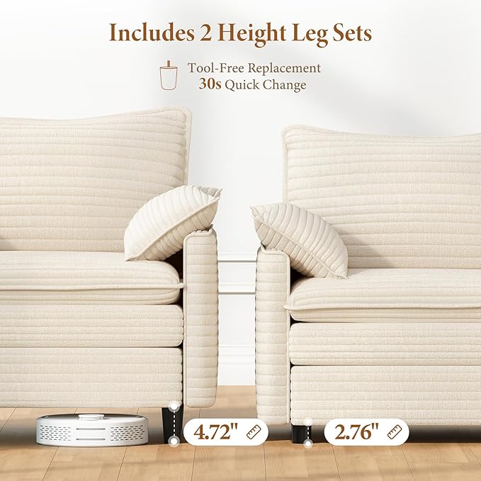 - Two Sets of Sofa Legs & Effortless Assembly: This oversized couch comes with two leg height options—2.76" and 4.72"—so you can customize the height to suit your preference. Choose the lower height for a relaxed look, or the higher height for easier access, which also allows robot vacuums to clean underneath with ease. Assembly is simple: with clear instructions and all the necessary tools included, you can have it setup in just 30 minutes with no extra equipment required