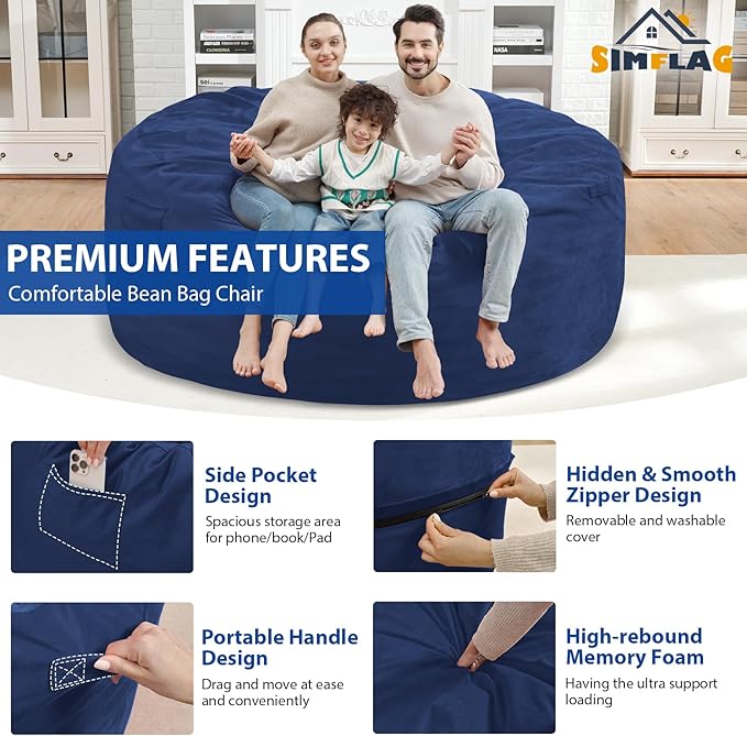 - CONVENIENT DESIGN: SIMFLAG bean bag sofa design with 4 thoughtful details, firstly, a pull-tab makes the bean bag chair easy to move around and manipulate. Second, an inter linner can contains the bean bag and allows you to wash the outside cover without spilling the beans. Third, a medium-sized pocket for your stuff. Fourth, a hidden zipper can prevent scratches to a people's delicate skin.