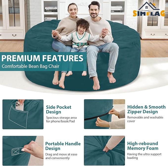 - CONVENIENT DESIGN: SIMFLAG bean bag sofa design with 4 thoughtful details, firstly, a pull-tab makes the bean bag chair easy to move around and manipulate. Second, an inter linner can contains the bean bag and allows you to wash the outside cover without spilling the beans. Third, a medium-sized pocket for your stuff. Fourth, a hidden zipper can prevent scratches to a people's delicate skin.