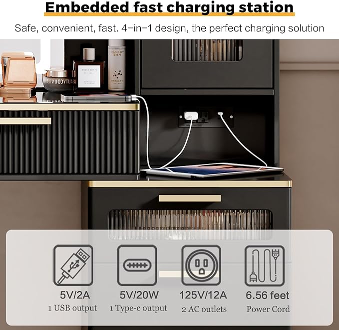 - 【Vanity Table with Charging Station】-This makeup vanity features a charging station, includes 2 standard plug sockets and 2 USB ports, which can be more convenient to connect your hair dryer, curling iron, and it can also charge your phone, tablet or other mobile devices, The unique design is more convenient for you to use.