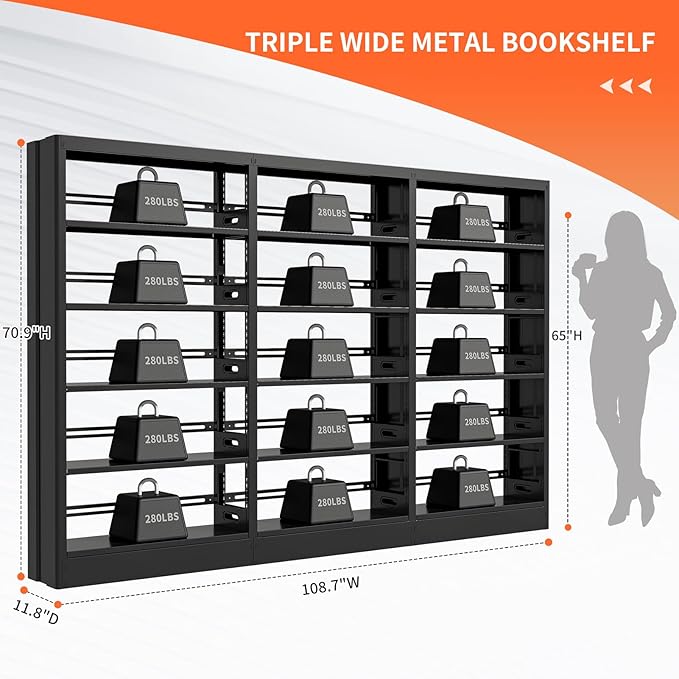 71" Metal Book Shelf, 5 Tier Bookshelf with Adjustable Shelves, Bookshleves and Bookcases, Heavy Duty Library Book Case, Expandable Combination Bookshelf (Black, 108.3" W)