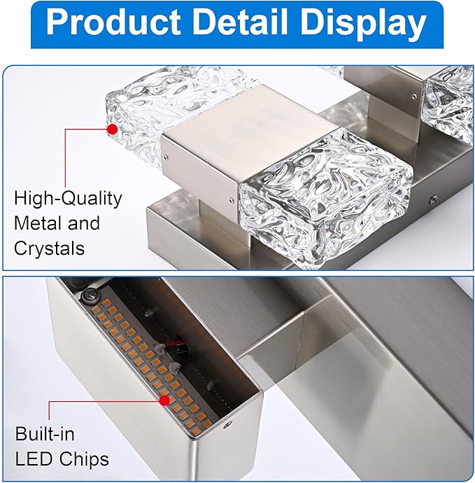 - Elegant Design: Modern bathroom led vanity lights perfect combination of sleek brushed nickel metal metal base and unique pattern crystal column create a modern yet luxurious aesthetic. When lit, it will cast a warm and beautiful lighting glow. Even when turned off, it can showcase a elegant atmosphere for decoration