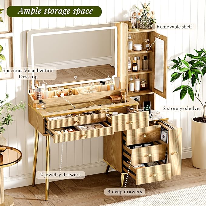 - 【Powerful Vanity Storage Space】-Are you still bothered by the fact that you have too many cosmetics and nowhere to put them? Try this makeup table with great storage function, containing 7 drawers, 3 open shelves, 2-layer hidden storage shelves with glass door, all your cosmetics and makeup tools can be sorted and stored neatly to the vanity table. Let you say goodbye to messy storage. It will be a great choice for you.