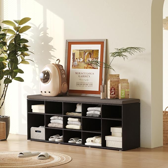 DINZI LVJ Shoe Storage Bench with Cushion, 13-Cubby Shoe Rack, Adjustable Shelves, Multifunctional Shoe Organizer Bench for Entryway, Mudroom, Hallway, Living Room, Bedroom and Garage, Espresso