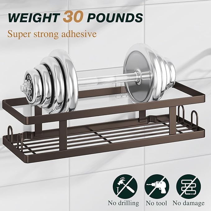 - Stonger adhesive:shower shelf come with ultra-powerful adhesive tapes that can hold up to 30 lb,it holds up well over time, even in humid conditions
