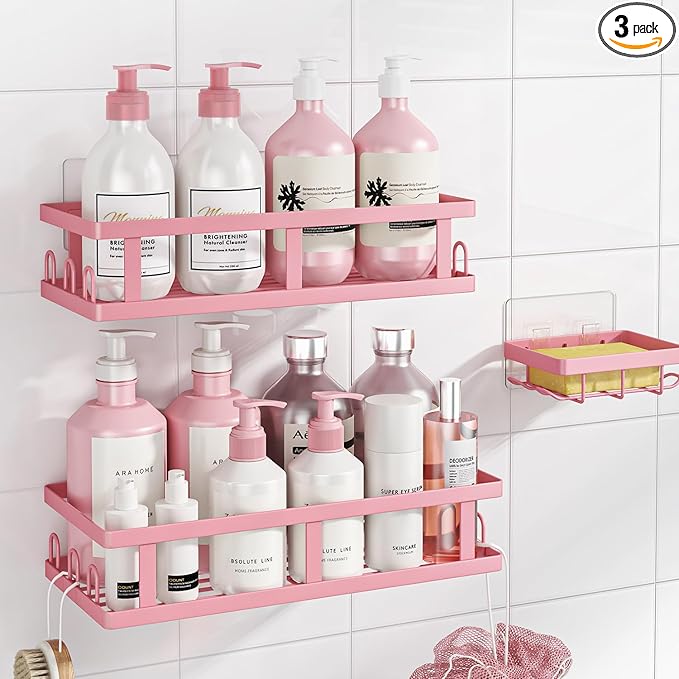 Shower Caddy Adhesive,No Drill Bathroom Organizer,Large Capacity Rustproof Shelves for Inside Shower,Bathroom Organizers and Storage,Pink