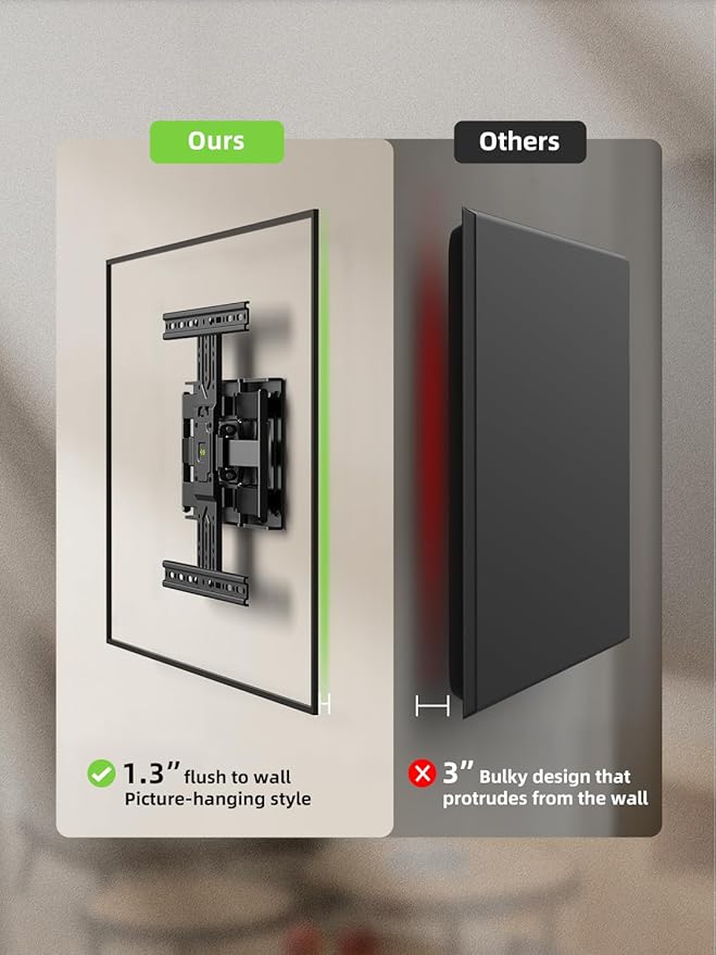 - Sturdy and Secure Construction:Built with heavy-duty steel alloys, this mount delivers uncompromising stability for TVs up to 99 lbs. The 6-arm reinforced swivel & tilt mechanism ensures rock-solid support while enabling smooth adjustments (±45° rotation / ±10° tilt). Engineered to resist bending, warping or sagging over time, its ultra-rigid construction keeps your TV securely anchored to wood studs, concrete or brick walls.