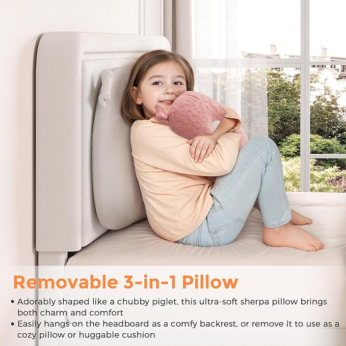 - CUTE REMOVABLE PILLOWS: This girls twin bed frame comes with 2 soft pillows, including one in white and one in pink. Each pillow is made from fluffy boucle fabric and designed in a cute shape. The pillows can be easily attached to the headboard with button loops to act as cozy backrests or removed to use as snuggly pillow or cuddle buddies. This boucle bed frame brings fun and functionality together for your dream room
