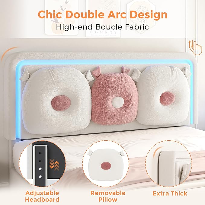 - Special Feature : Adjustable Double Headboard, Cute Removable Pillows, No Box Spring Needed, Underbed LED Light