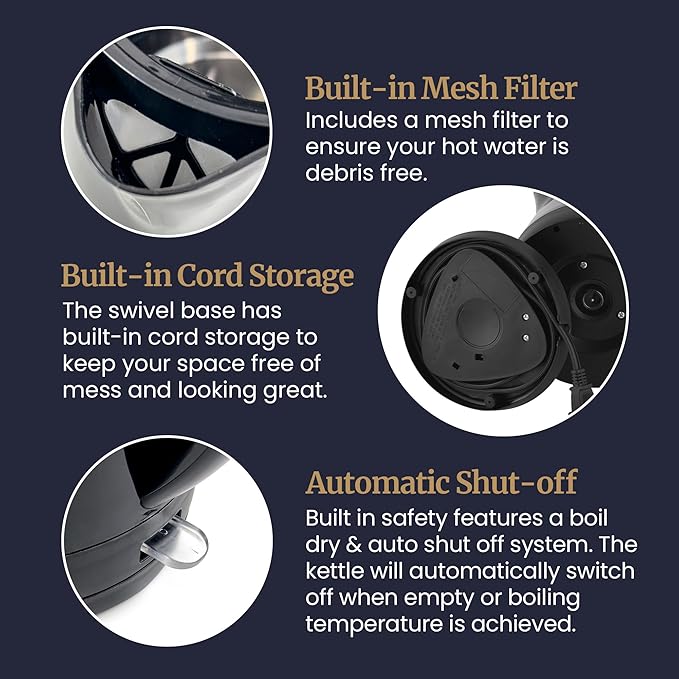 - EASE OF USE: One-touch lever to begin boiling with high efficiency concealed heating system with Auto-Shut Off and Boil-Dry Protection for safe use. Clearview window with water level markings and a 360° swivel base for cord free serving.