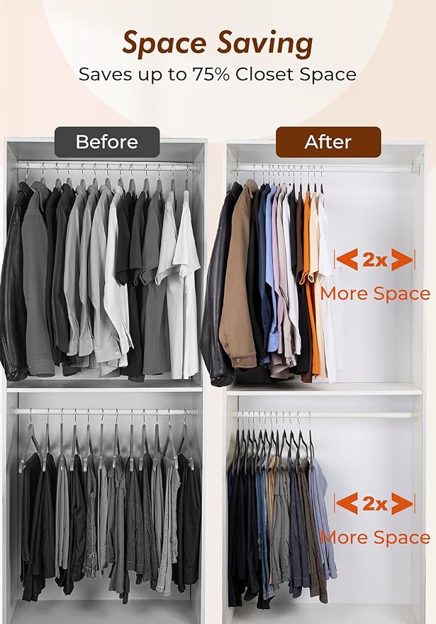- Space Saving Hangers: Ultra thin design maximizes closet space – fits 2x more garments than bulky plastic hangers or wooden hangers; Size of 17.5"L x 1/4"W x 9"H meets your needs for daily clothing organization and storage
