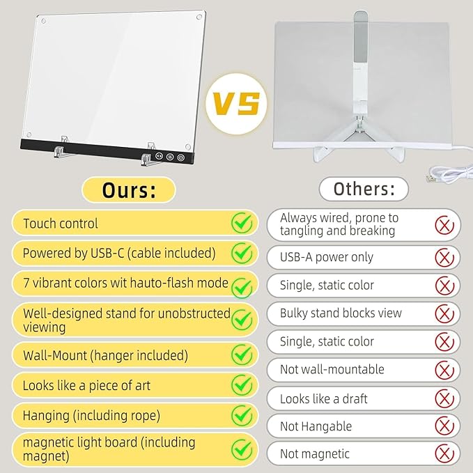 - Complete Accessories: This acrylic dry erase board with lights comes with 2 invisible stands for stable support, a USB power cable for reliable power supply, a soft cleaning cloth for easy maintenance, 4 magnets, and a durable chain. It also includes 8 vibrant pens, allowing you to create colorful and eye-catching designs right out of the box for a seamless, versatile experience