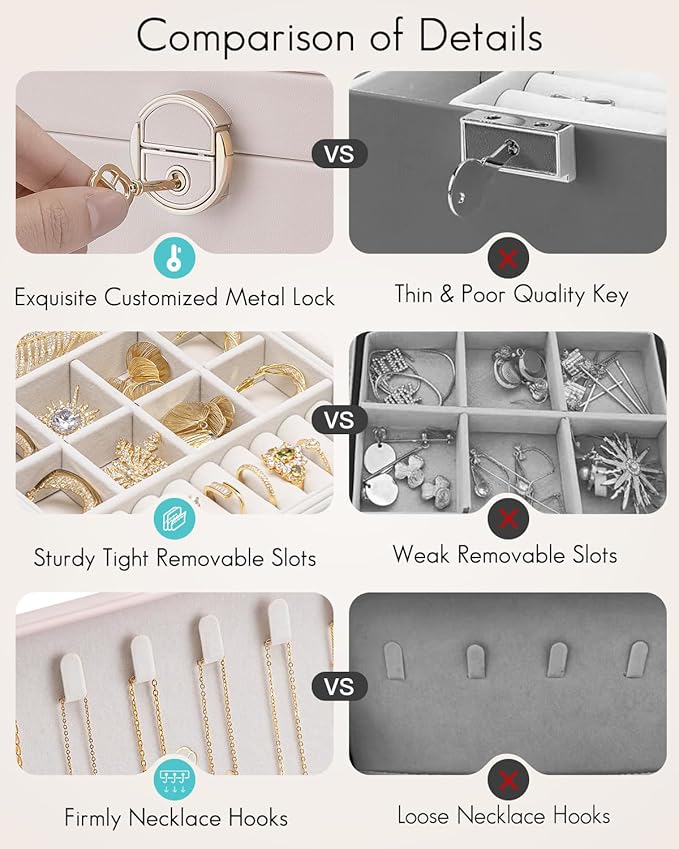 - LOCKABLE JEWELRY BOX: Custom VLANDO logo key to the right to rotate 180°to lock the jewelry case, prevent children from rummaging through jewelry,better custody of your belongings. You can also not use the key, with a carabiner to open and close very convenient