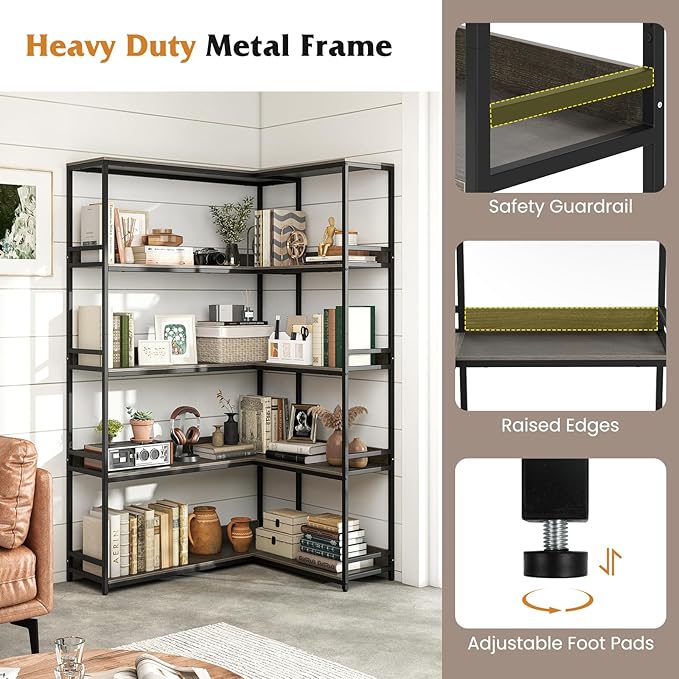 Tangkula Large Corner Bookshelf, 90 Degrees 5-Tier Industrial Wood Open Corner Bookcase for Small Spaces, Heavy-Duty Metal Frame, 71”H L-Shaped Storage Display Rack for Living Room (Oak)