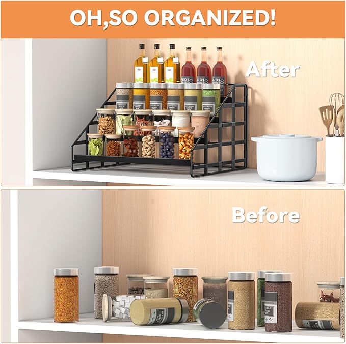 - 4-Tier Stepped Organizer:The 4 tier spice rack stepped design provides easy visibility and access to all of your spices. You can easily find and take them out while cooking. While each tier is surrounded by a fence to prevent spices from falling.