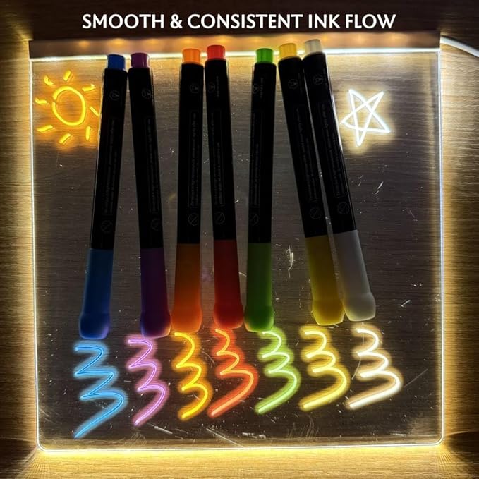 - 【Use Across 6+ Surfaces – From Boards to Windshields】 Write, doodle, and design freely—these vibrant neon markers work on LED note boards, whiteboards, car windshields, mirrors, glass, porcelain, and even fabric. Whether you're labeling mugs, decorating windows, or creating signs for events, these markers deliver vivid color and stay put until you wipe them away
