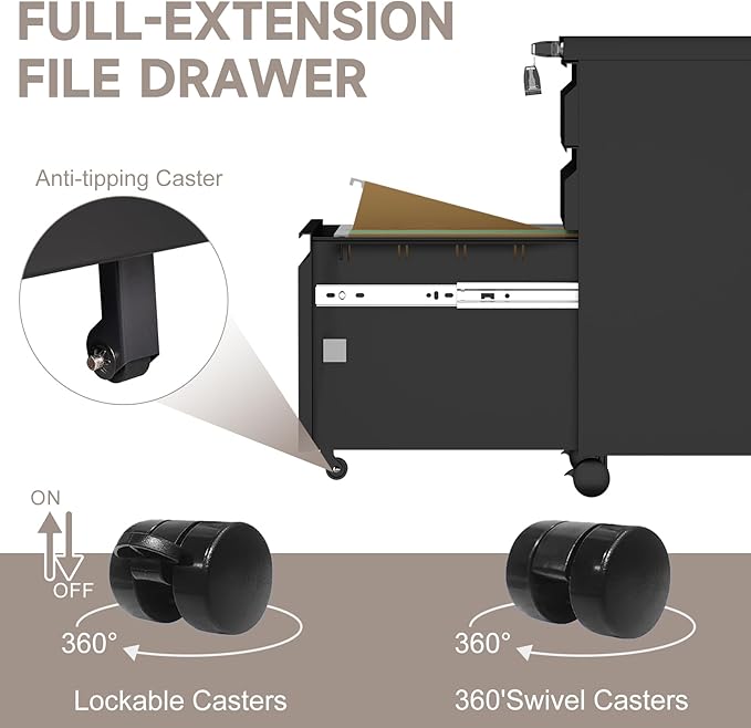 - 【Convenient Casters】This small file cabinet for under desk is equipped with 2*360° swivel casters, 2 front casters with brakes and 1 anti-tipping caster, easy to move and can be fixed under the table at any time, the first two casters can be locked to prevent tipping when pulling out the drawers.
