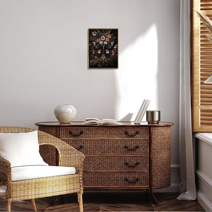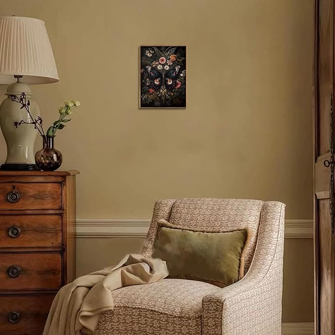 Djmwtb Vintage Framed Wall Art Butterfly Canvas Wall Art Prints Gothic Botanical Floral Pictures Dark Academia Flower Painting Artwork for Living Room Bedroom Bathroom Office 12x16in