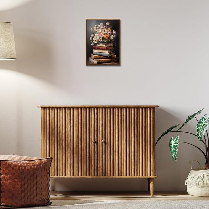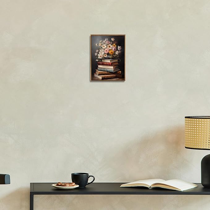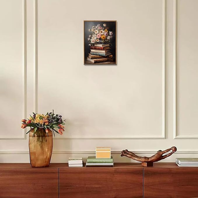 Djmwtb Vintage Framed Wall Art Floral Book Canvas Wall Art Prints Moody Flower Painting Literary Pictures Artwork for Living Room Bedroom Bathroom Office 12x16in