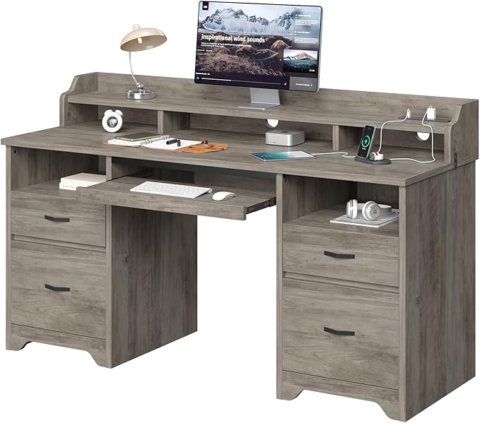Bestier Farmhouse 59" Executive Desk with Drawers, Wood Computer Desk with Charging Station, Home Office Desk with Keyboard Tray & Monitor Stand, Sturdy Pedestal Desk for Work Study, Grey