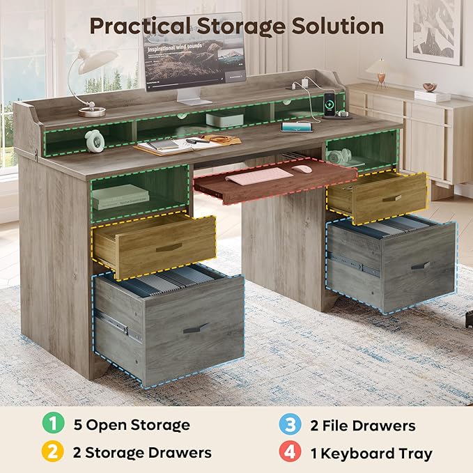- Ample Storage & Organization: Features a smooth-glide keyboard tray, two open cubbies, two utility drawers and two file drawers with adjustable rails (fits A4/Letter/Legal). Everything you need for work or study stays neatly organized at your fingertips