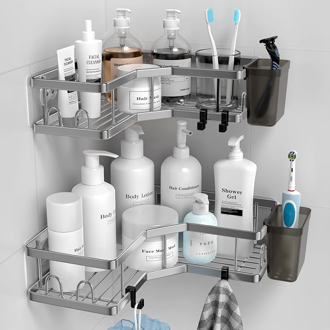 - [Space-Saving & Stylish Design]: Upgrade L-Shaped corner shower caddy is designed for making great use of corner space. Great shower organizer can organize most toiletries in the bathroom and help to create a clean finished look in your shower. Extremely handy for shower organizing.