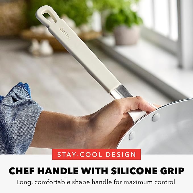 - STAY-COOL CHEF HANDLE: Inspired by restaurant kitchens, this pan has a long chef handle with a stay-cool silicone grip that gives you total control and amazing comfort